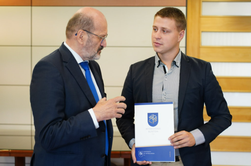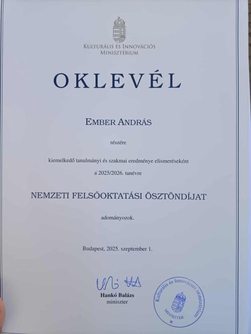 2025. október 2-án ünnepélyes keretek között adták át a Nemzeti Felsőoktatási Ösztöndíj okleveleit a Nyíregyházi Egyetem öt kiemelkedő hallgatójának. Az elismeréseket dr. Szabó György, az egyetem rektora nyújtotta át, aki hangsúlyozta, hogy a 2025/2026-os tanévben az intézmény több mint ötezer hallgatója közül mindössze öt diák érdemelte ki ezt a rangos elismerést. Az ösztöndíjasok névsorát már augusztus 30-án, a Tanévnyitó Ünnepi Szenátusi Ülésen kihirdették. A Kulturális és Innovációs Minisztérium által adományozott ösztöndíj a felsőoktatás egyik legjelentősebb hallgatói kitüntetése, amelyet tíz hónap időtartamra ítélnek oda azoknak, akik kimagasló tanulmányi eredményük, közösségi aktivitásuk és szakmai munkájuk révén példát mutatnak társaik számára. Az öt ösztöndíjas között van intézetünk III. évfolyamos, tanító szakos hallgatója, Ember András. Az alábbiakban az ő gondolatait olvashatjuk az elismeréssel kapcsolatban.