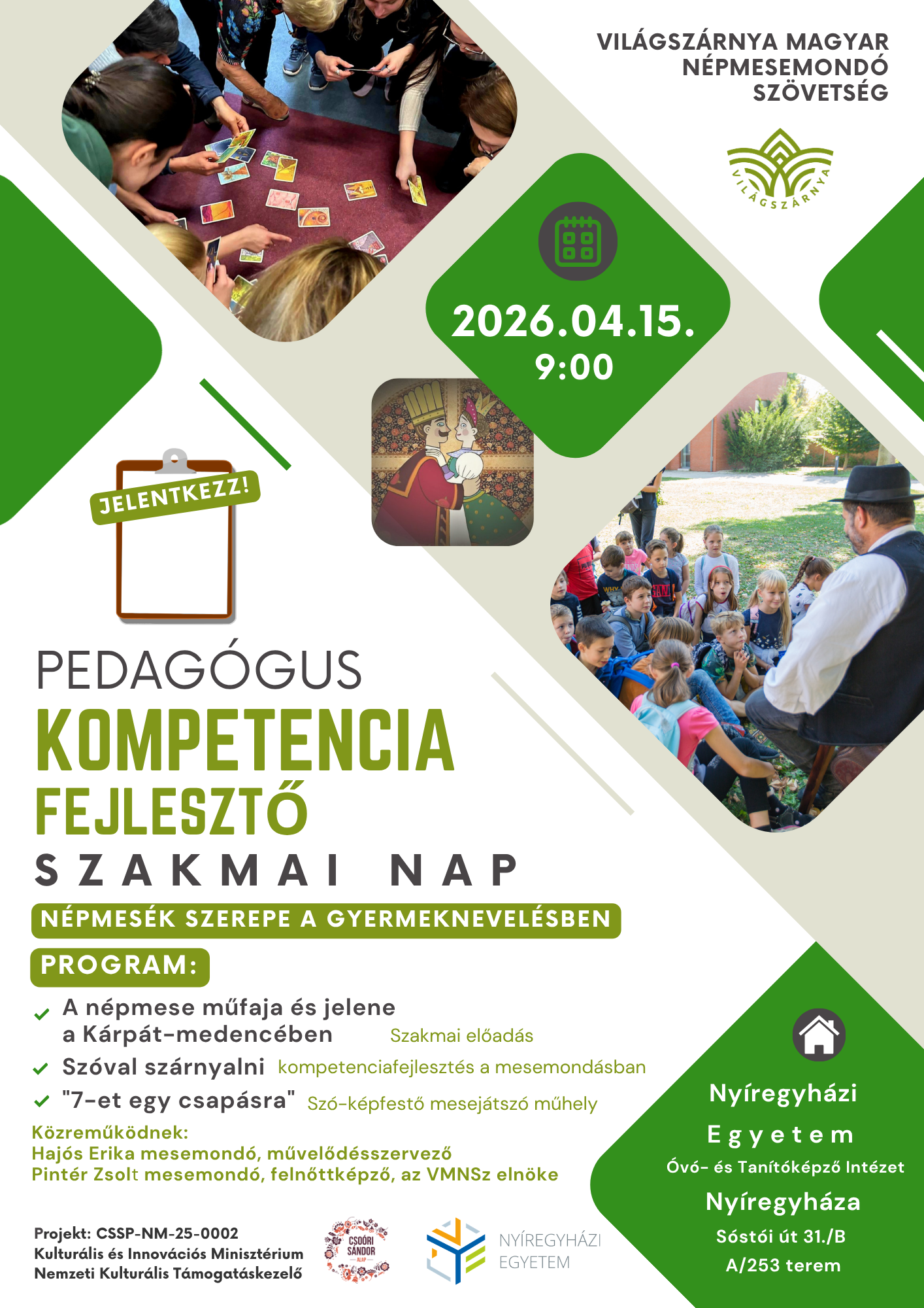 Szeretettel hívunk minden érdeklődőt a Világszárnya Magyar Népmesemondó Szövetség és az Óvó- és Tanítóképző Intézet "Pedagógus Kompetencia Fejlesztő Szakmai Nap" című közös rendezvényére. Részletek a plakáton találhatók.